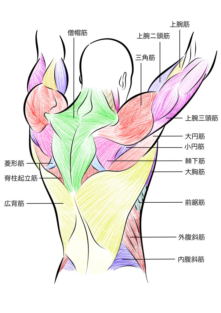 メインターゲットとなる筋肉は大円筋と広背筋上部です。。